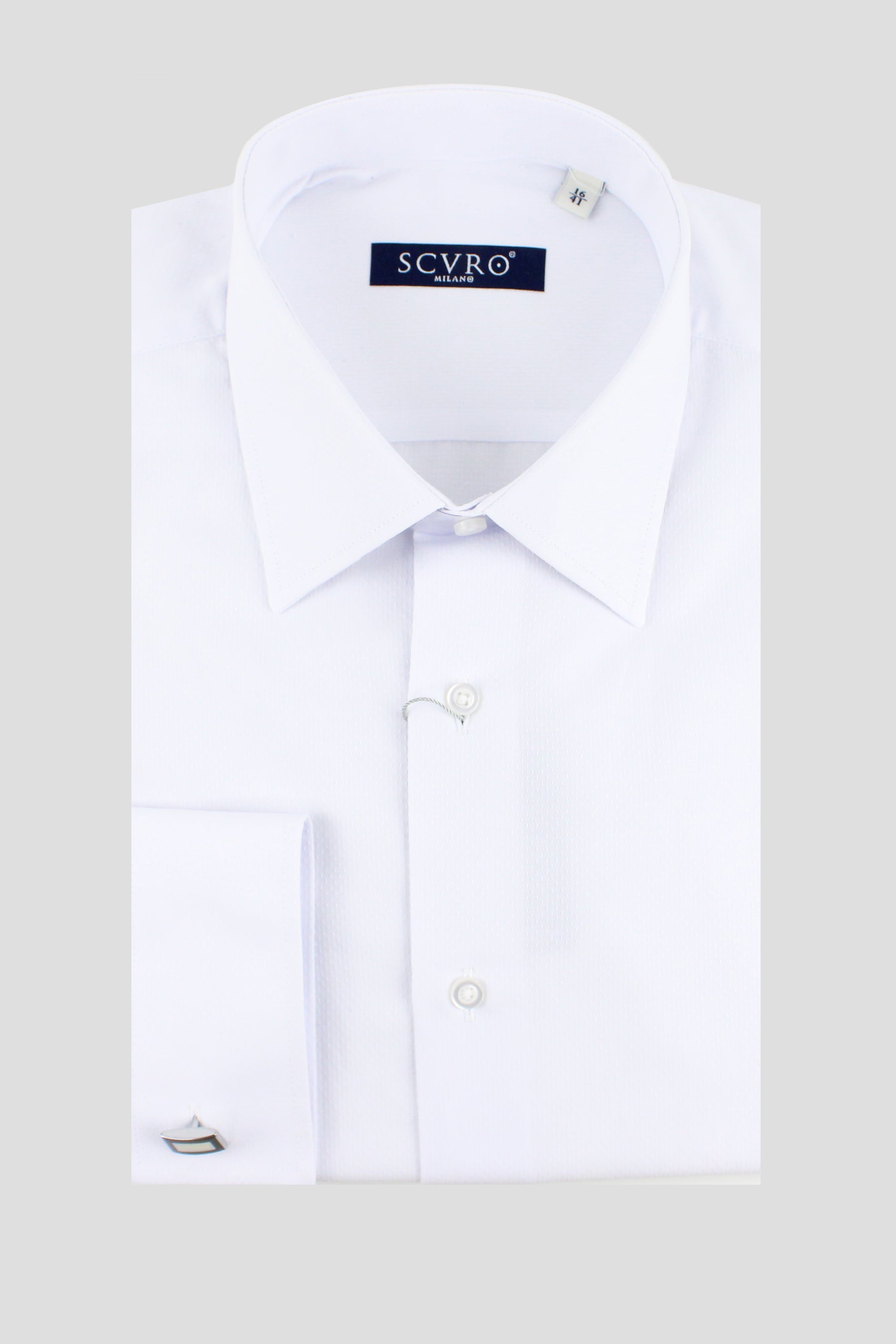 Questa camicia classica bianca è fatta di un sofisticato tessuto operato, ed è dotata di polsini gemello per accentuare un look elegante. Realizzata con cura interamente in Italia.